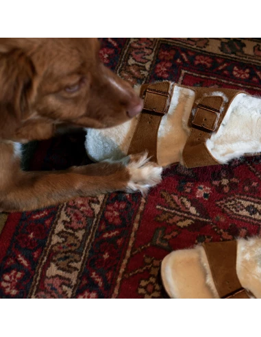 Découvrez cette nouvelle variante La semelle de propreté en fourrure d’agneau naturelle et les brides doublées de fourrure d’agneau lui donnent du style et gardent vos pieds bien au chaud. La chaussure idéale pour les soirées d’hiver au coin du feu !