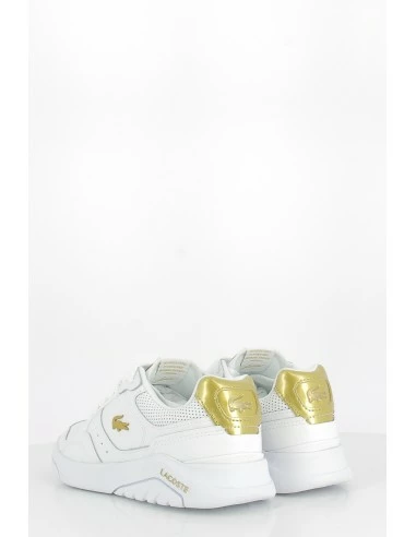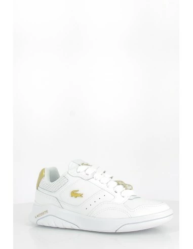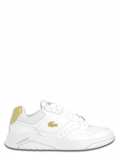 Baskets de ville pour femme de couleur blanche avec une languette doré, et son logo Lacoste sur le coté latérale de la chaussure.