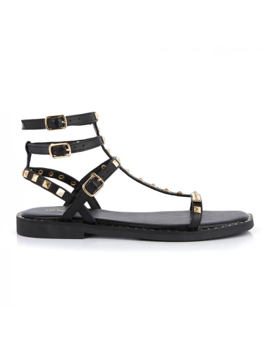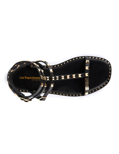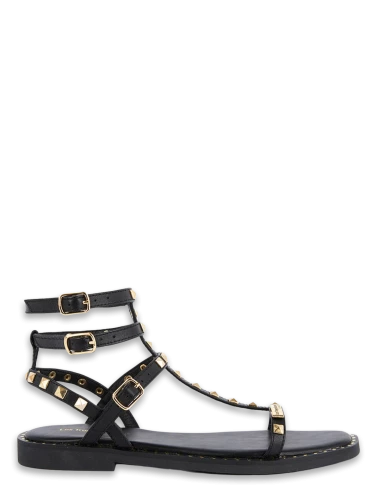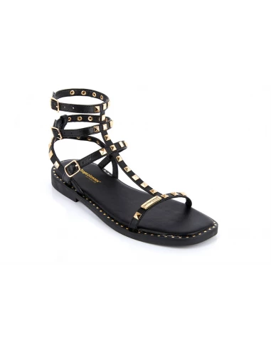 Sandales femme CORALIE noires cuir lisse, recouvertes de clous pyramidaux dorés sur tige en cuir.