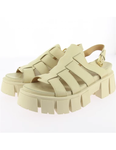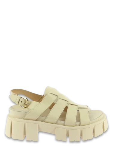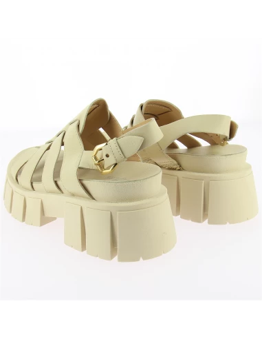 Sandales Mjus en cuir beige avec une grosse semelle crantée.