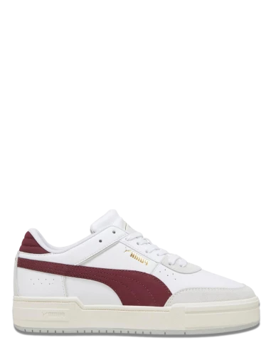 Vous trouverez une tige en cuir blanc, un form stipe bordeaux et une couche d’usure sur la semelle grise clair.
