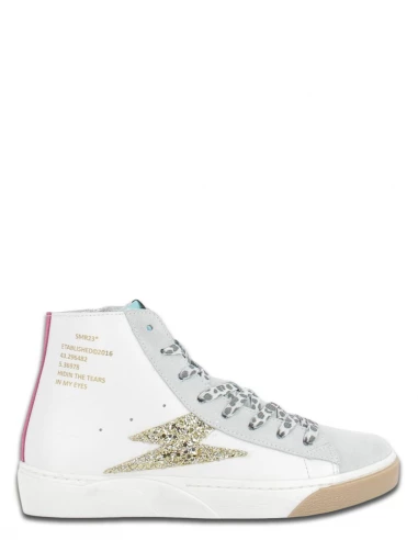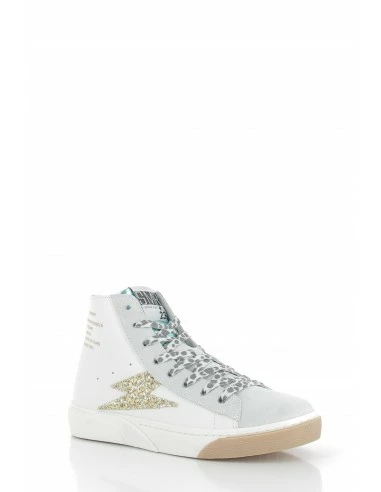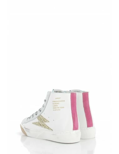 Cette version propose un laçage imprimé léopard, une tige en cuir blanc accompagné d’un éclair doré.